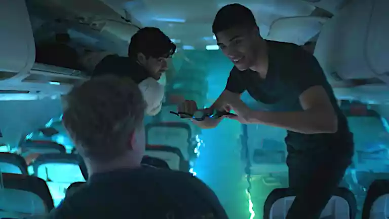 بسیاری از مردم از پرواز میترسند. اما وقتی در هواپیما هستید، معمولاً انتظار ندارید که کوسه شما را بخورد. «بدون راه فرار» این ترسها را با بالا بردن سطح خطر با احتمال خفگی، غرق شدن و له شدن زیر آب ترکیب میکند. این سناریوی غیرقابل تصور بقا با گیر افتادن یک پرنده در موتور هواپیما روی بال هواپیما، منفجر شدن موتور، ایجاد سوراخی در بدنه هواپیما، سقوط هواپیما در آب، فرود آمدن در زاویه ای رو به پایین در لبه یک صخره زیر دریا ایجاد میشود. به طوری که یک کیسه هوا در قسمت عقب هواپیما گیر می کند. سپس یک کوسه کنجکاو شده و در نزدیکی سوراخ هواپیما کمین میکند، در حالی که بازماندگان در مورد کارهایی که قبل از تمام شدن اکسیژن و قبل از اینکه فشار آب قسمت عقب هواپیما را منهدم کند، بحث میکنند.